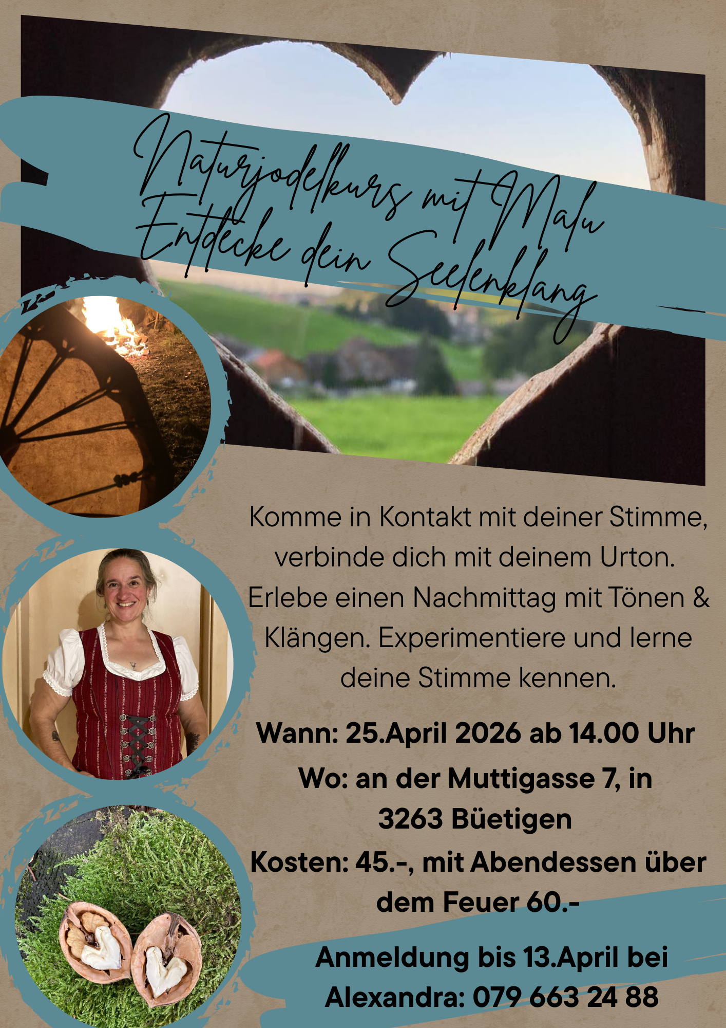 Im Frühling findet ein Naturjodelworkshop mit der wundervollen Malu aus dem Zürcher Oberland statt. In der Energie des Frühlings, mit Unterstützung des Elementes Luft entdecken wir unsere Stimme, lernen vielleicht sogar unser Seelenklang kennen und machen uns auf eine gemeinsame Reise zu uns selbst.